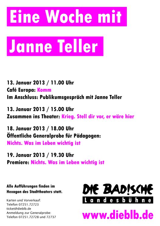 Im Januar 2013 findet an der Badischen Landesbühne in Bruchsal eine „Woche mit Janne Teller“ statt. Zum Auftakt dieser Veranstaltung am 13. Januar wird Frau Teller auch nach Bruchsal kommen und mit unserem Publikum ins Gespräch kommen. Natürlich besteht auch die Möglichkeit, vor Ort Bücher von Janne Teller zu kaufen und signieren zu lassen.